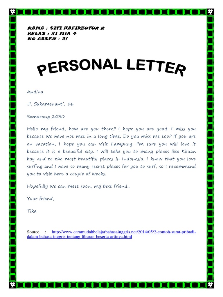 Salah satu contoh yang mungkin tergolong mudah untuk dibuat tentu berkaitan dengan pengalaman liburan yang pernah kita alami. Contoh Surat Pribadi Dalam Bahasa Inggris Surat-menyurat telah menjadi bagian hidup manusia sejak dahulu kala. 18 Contoh Surat Pribadi Informal Tidak Resmi dalam Bahasa Inggris Beserta Artinya Pada diskusi sebelumnya tentang surat dalam bahasa Inggris kita telah ketahui bersama bahwa surat bahasa Inggris dibagi menjadi dua kelompok yaitu surat informal bahasa Inggris dan surat formal bahasa Inggris.