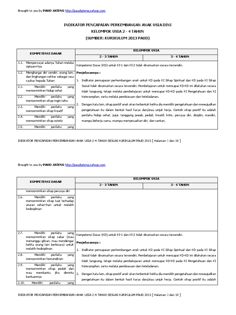 KURIKULUM 2013 PAUD No KDKompetensi Dasar Kelompok Usia 4- 5 6tahun Kelompok A Kelompok Usia 5 6 tahun Kelompok B 1 11Mempercayai adanyaTuhan melalui ciptaan-Nya Kompetensi Dasar KD untuk KI-1 dan KI-2 tidak dirumuskan secara tersendiri. Dibawah ini adalah contoh indikator PAUD yang dapat digunakan untuk anak usia 3 sampai 4 tahun. Prota KB PAUD Usia 3-4 Tahun.