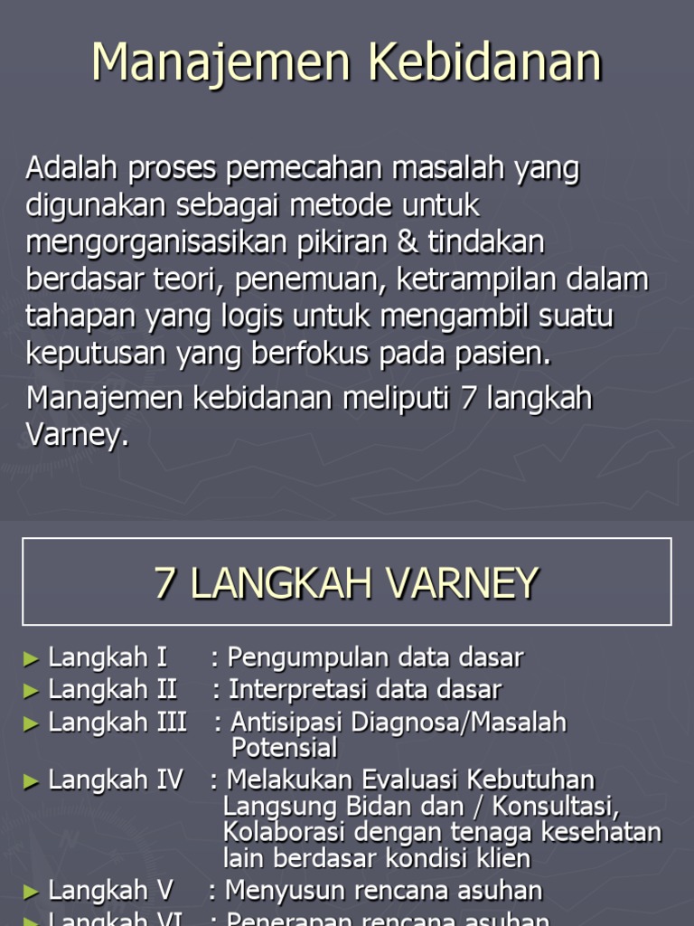 Manajemen Kebidanan Menurut Varney Ada 7 Berikut ini langkah-langkah tersebut beserta penjelasannya. Kewajiban Bidan terhadap sejawab dan tenaga kesehatan lainnya 2 butir 4. Tujuh langkah manajemen kebidanan menurut Varney.