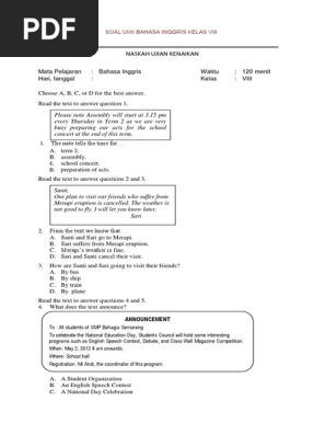 B Untuk mengunduh Soal UKK PAT Bahasa Inggris SMP Kelas 7 TA 20172018 diatas silahkan klik tautan di bawah ini yaa Download Soal UKK Bahasa Inggris SMP Kelas 7 DISINI Baiklah cukup sekian Soal UKK Bahasa Inggris SMP Kelas VII TA 20172018 yang bisa kami berikan kali ini. Kisi-kisi Soal UAS Matematika Kelas 8 Semester 2 K13 Revisi 2018. File tersebut berformat pdf.