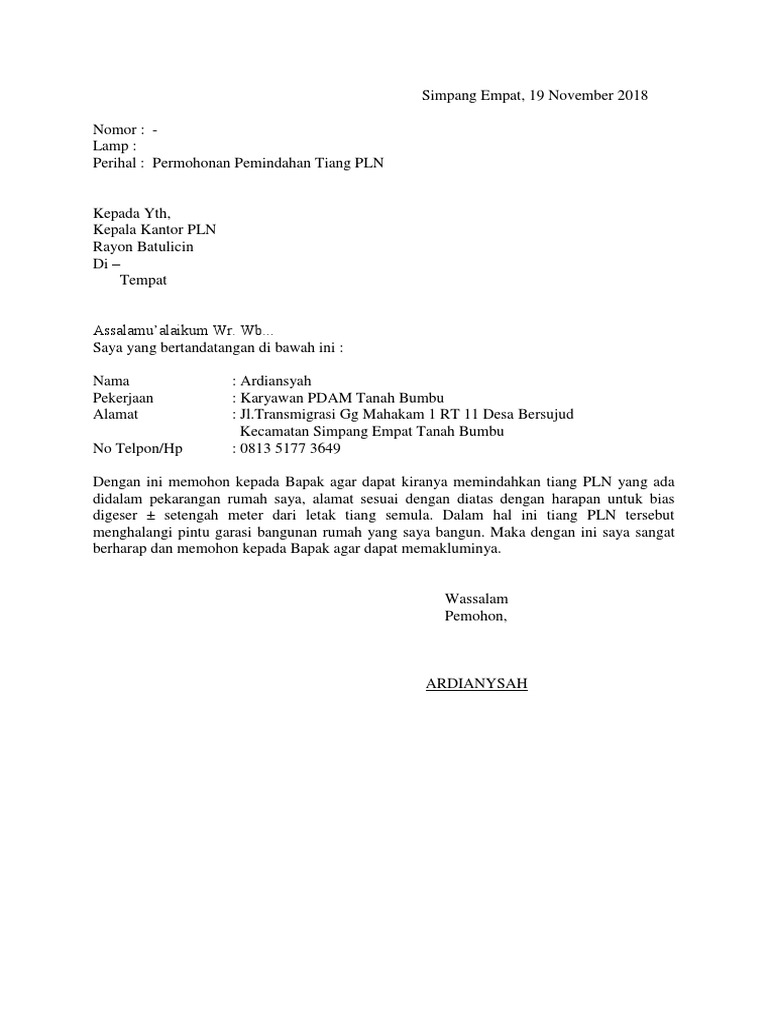 Surat permohonan pemindahan meteran listrik. Itulah yang dapat kami bagikan terkait contoh surat permohonan pindah tiang listrik ke pln. Contoh Surat Permohonan Pemindahan Tiang Listrik Kumpulan. Seperti itulah contoh surat permohonan pemindahan tiang listrik milik perusahan milik negara PLN yang diperbolehkan kita tulis dengan disertai tanda tangan yang bersangkutan dan juga harus membuat tembusannya.